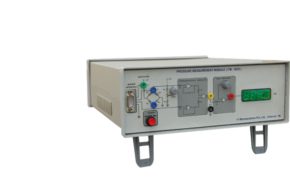 This module consists of a (0-100) psi pressure transducer of strain gauge type fixed in a pressure tank, one manually operated pump to develop pressure, pressure gauge and 3½ digital indicator to display the pressure.